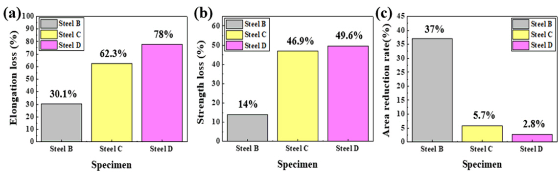 이는 시편이 주어진 산성용액에 노출되면서 표면의 국부부식 발생 및 환원반응을 통해 형성된 수소원자의 유입에 의해 강재가 취화된 데에 따른 결과로 판단된다.