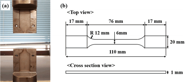 시편의 슬립현상에 따른 부작용을 전적으로 배제시키고자 시편을 고정하는 지그 (jig)를 그림 3(a)와 같이 제작 하였으며, 가공된 시편의 dimension은 그림 3(b)와 같다. 실험은 1 × 10-6 /s의 매우 느린 변형률로 시편이 파단될 때까지 진행하였으며, 실험결과에 의한 연신율, 시편 단면적 및 인장강도의 감소량을 토대로 SCC 민감도