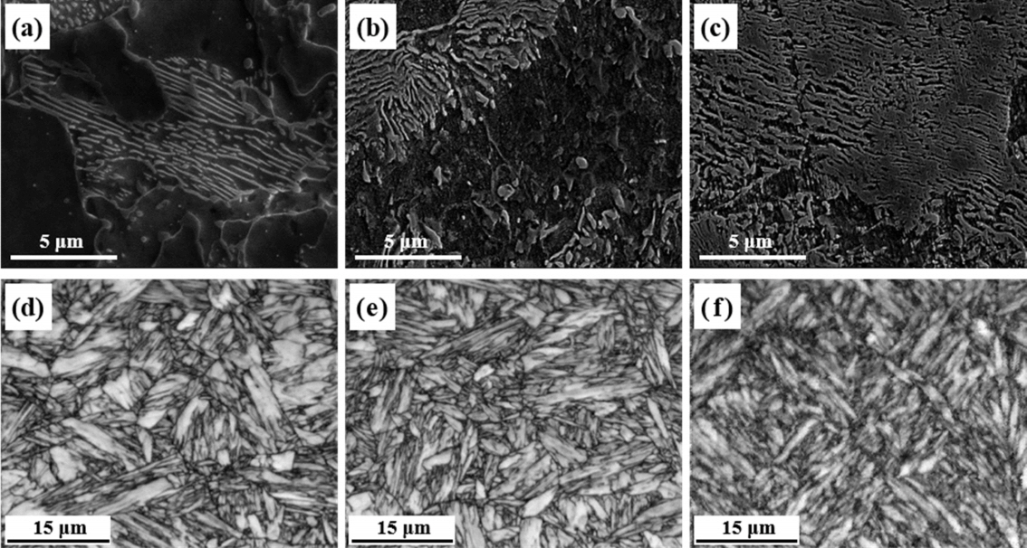 조직을 형성하고 있었고, C 함량이 증가할수록 펄라이트의 분율이 증가함을 알 수 있다. QT 처리 후에는 그림 4(d, e, f)에 나타낸 것과 같이 래스 (lath) 타입의 템퍼드 마르텐사이트(tempered martensite) 조직이 관찰되었고, EBSD의 TSL analysis