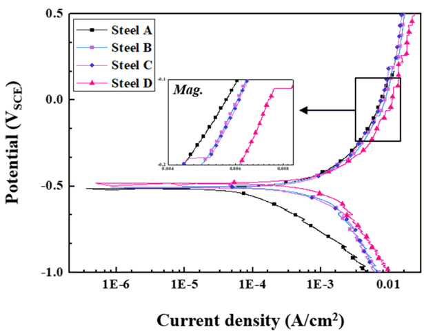 보다 용이하게 일어날 수 있다 [8]. 따라서, carbide 분율이 가장 높은 시편 D에서 음극 환원반응, 즉 수소의 환원반응이 가장 높은 것으로 이해할 수 있다. 또한 전기화학적으로