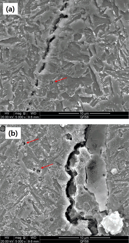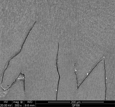 본 연구에서도 그림 11(a) 에서와 같이 카바이드 주위에 많은 균열이 형성되어 서로 성장하고 있음을 보여주고 있고, (b)에서는 균열이 합체되어 성장한 것을 보여주고 있다. 즉, 균열은 카바이드 주위에서 형성되어 결정립계를 따라서 성장한 것으로 확인할 수 있다. 또한,