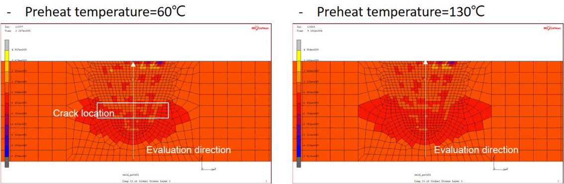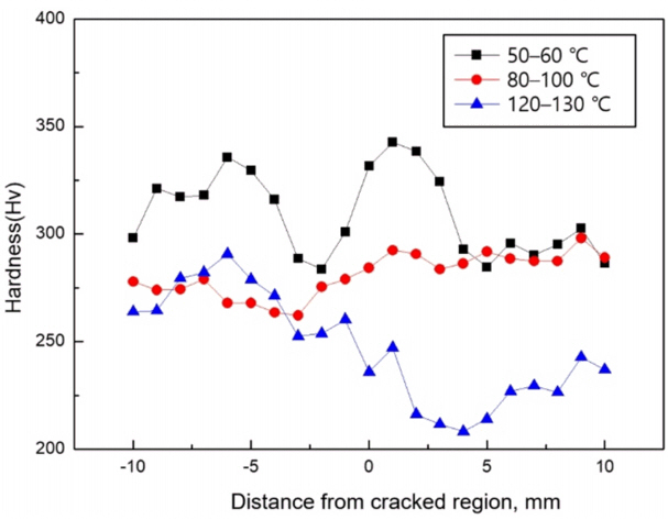 온도가 낮은 시험편이 예열/층간 온도가 높은 시험편보다 균열에 더 민감할 수 있음을 확인하였다.