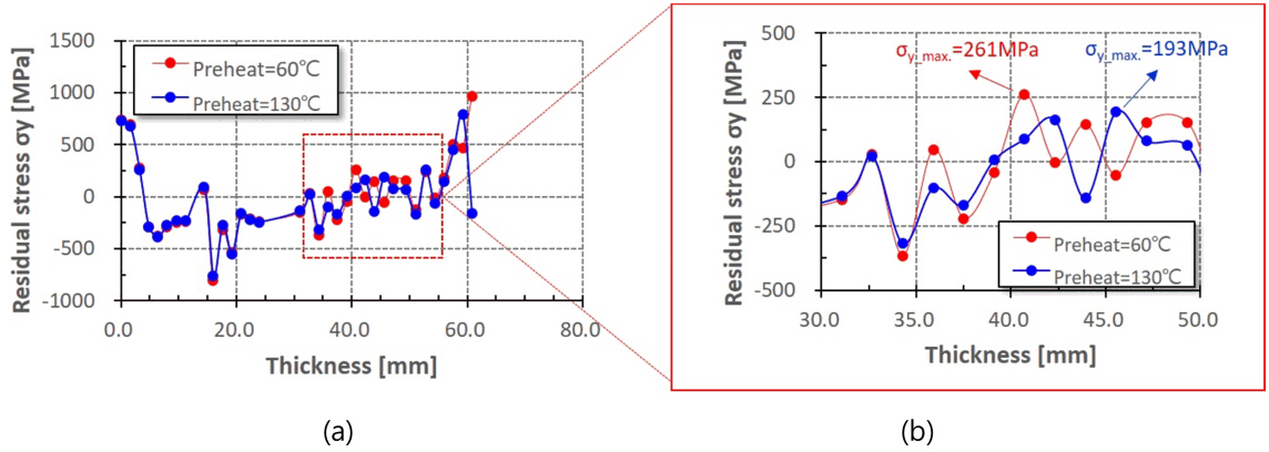 완화됨을 보이고 있고, 특히, 예열 대비 층간 온도가 잔류응력에 더 큰 영향을 미친다고 보고 하고 있다 [21]. 이에 본 연구에서도 예열/층간 온도인 60도, 130도를 적용하여 잔류응력 변화를 해석하였다. 그림 13에 사용한 모델을, 그림 14 및 15에 잔류응력 해석 결과를 보여주고 있다. 재열 균열의 발생 방향을 고려하여 용접선에 수직인 잔류응력을 두께 방향으로 추출하였는데, 전반적으로 잔류응력