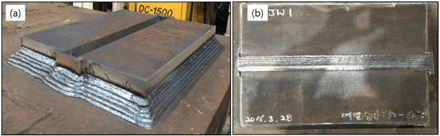 예열 및 층간 온도를 각각 50도-60도, 80-100도 및 120-130도로 제어하여 용접을 수행하였다. 상세한 용접조건 및 이음부 형상은 표 2 및 그림 1에 나타내었다. 용접시공승인 시험에서 용접균열이 발생하지 않더라도 실제 구조물 용접에서는 구속도의 영향으로 균열이 발생되는 경우가 많다. 따라서,