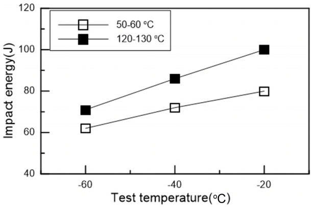 충격 시험은 온도 별로 3개의 시험편을 시험하였고, 그 평균값을 그림 4에 나타내었다. 충격에너지는 예열/층간 온도가 높아질수록 인성이 향상되고 있음을 확인하였다. 예열/층간 온도의 역할은 냉각 속도를 지연시켜 조직 내의
