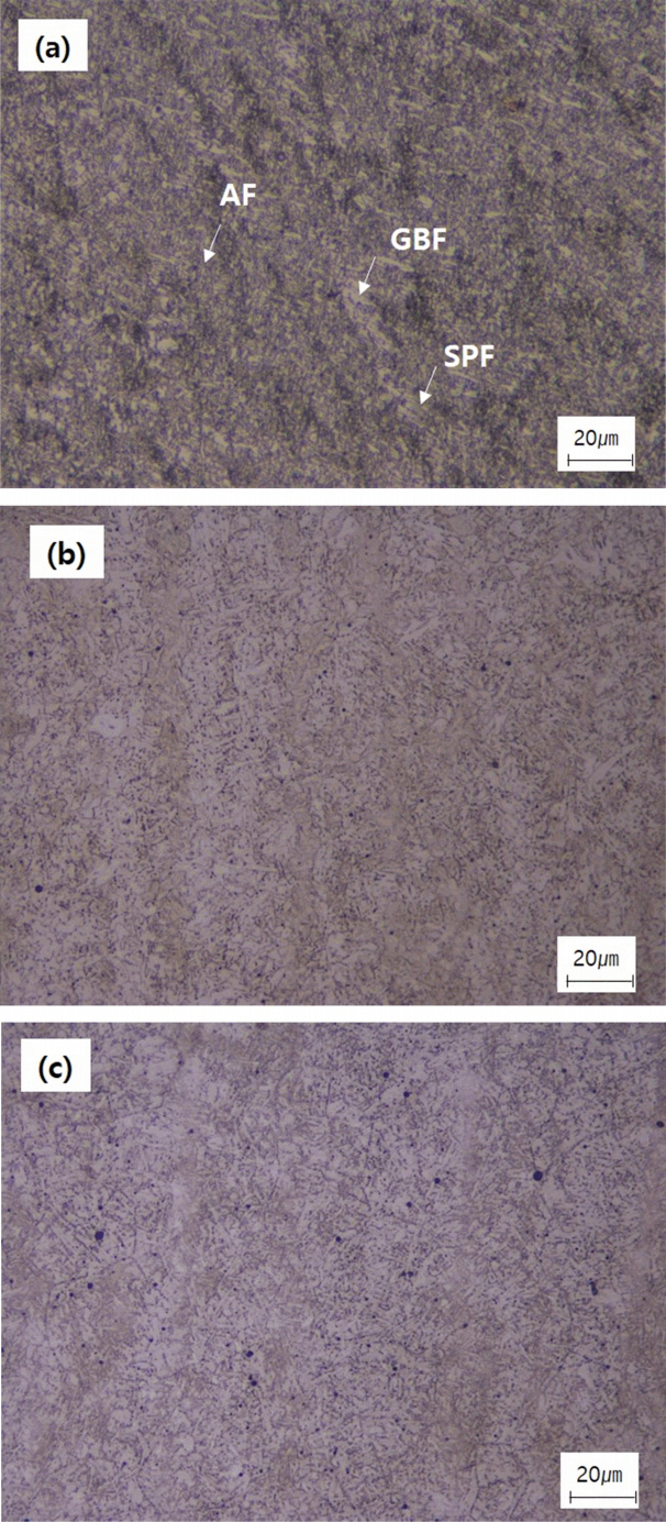 나타낸다. 그림 5(a) 에서 보는 바와 같이 예열/층간 온도가 낮은 시험편인 경우, 빠른 냉각속도의 영향으로 인하여 날카로운 침상 페라이트가 많이 형성되어 있고, 예열/층간