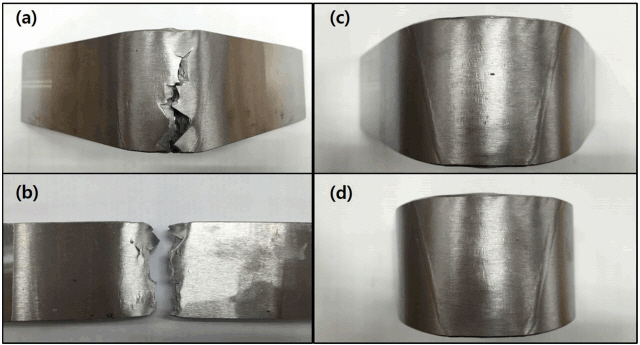 본 연구에서는 표 3과 같이 초음파 탐상 검사를 이용하여 균열을 찾지는 못하였으나, 굽힘 시험을 통하여 균열의 존재 여부를 확인하였다. 굽힘 시험 후의 시험편 사진을