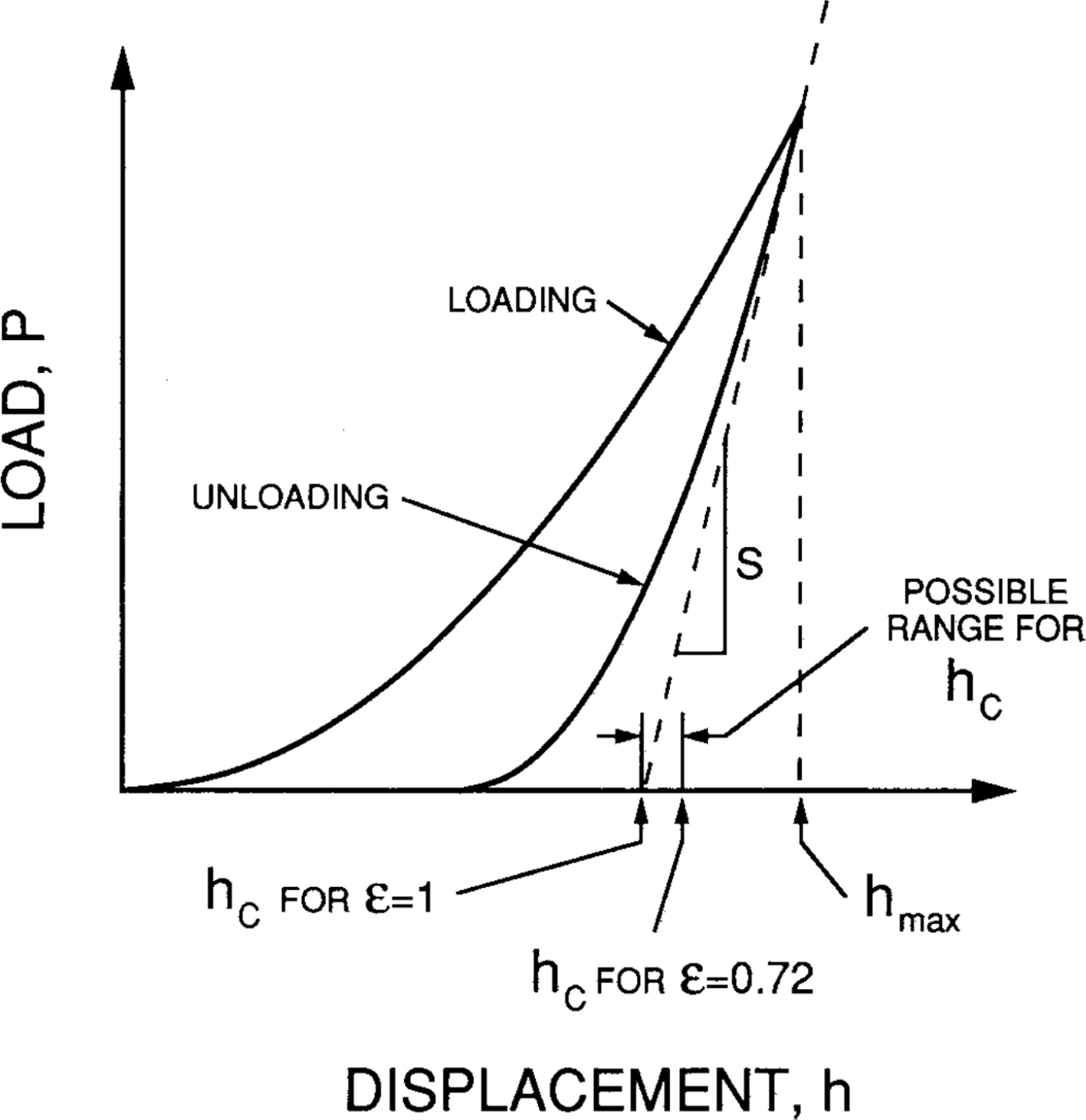 일반적으로 나노인덴테이션 실험의 해석은 그림 5의 인덴테이션 하중-변위 그래프와 같이 하중과 변위를 기반으로 이루어진다. 그림 5의 하중 적용 구간 (loading)에서는 시편 표면에 인덴터가 침투하면서 탄성 및 소성 변형이 혼재된 복잡한 변형이 일어나고 지속적인 접촉 면적의