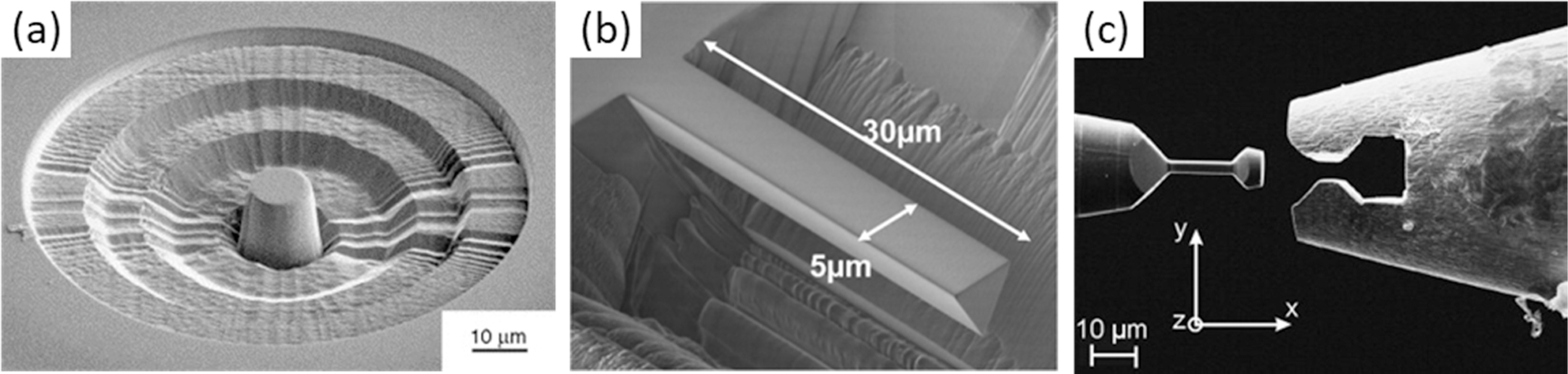 FIB의 마이크로 또는 나노 단위 형상의 시편 제작 기술을 활용한 미소 단위의 실험은 단결정의 마이크로 필라 (micro-pillar) 형상의 시편과