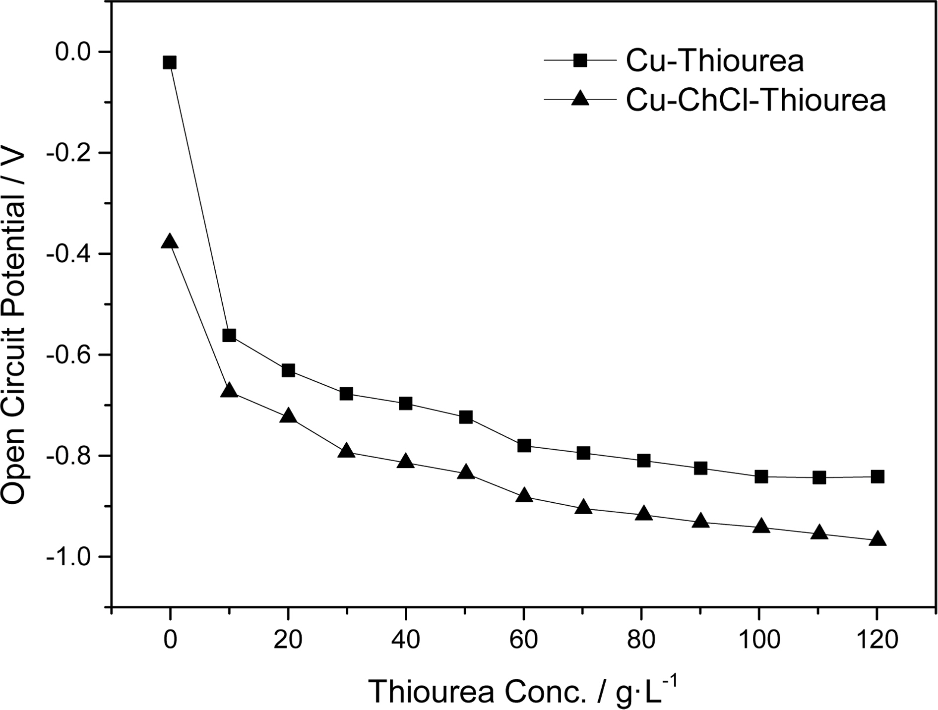 Effect of Thiourea concentration on OCP of Cu working electrode (square) and Thiourea