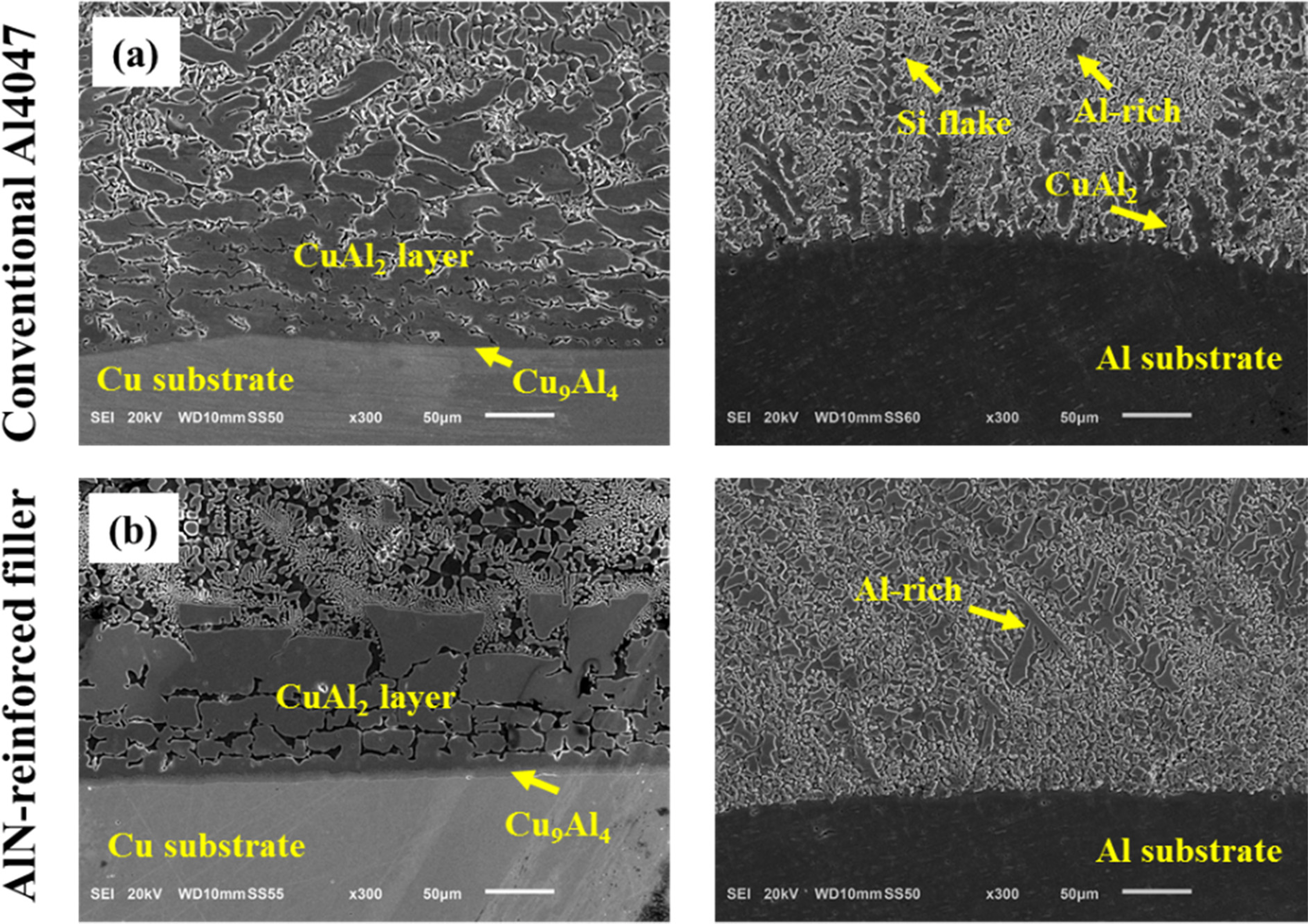 Al/Cu dissimilar brazing using (a) conventional A14047 and (b) 0.10% AlN-reinforced