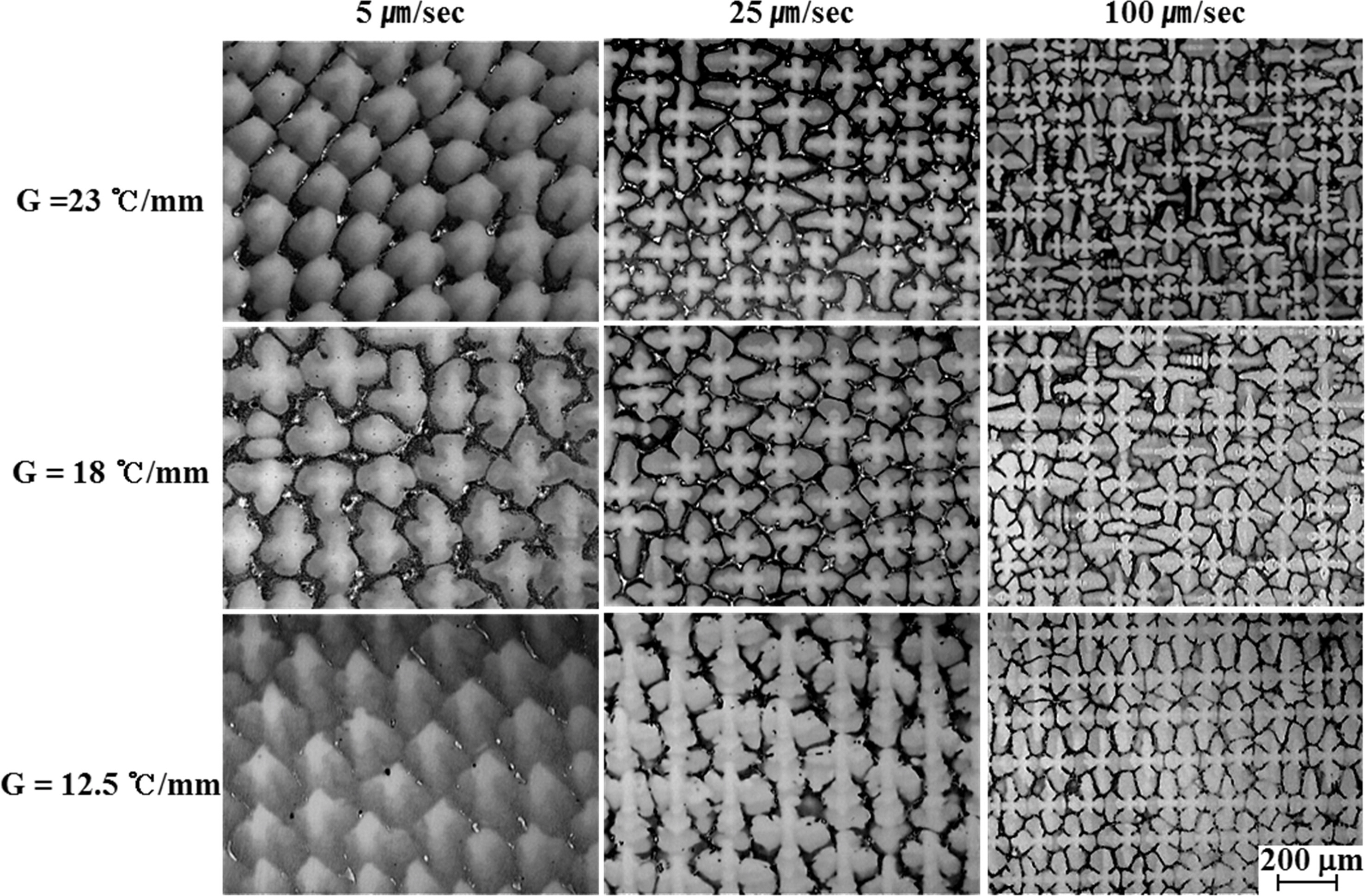 의해서 계면 형상에 의해서 구분이 가능한데,2차 수지상은 응고속도가 5 μm/s 이상의 조건에서 형성되는 것을 그림 2에서 확인할 수 있다. 온도경사 12.5, 18, 23 K/mm 조건에서 5 μm/s 이상의 응고속도에서 2차 수지상 이 잘 발달한 것을 확인 할
