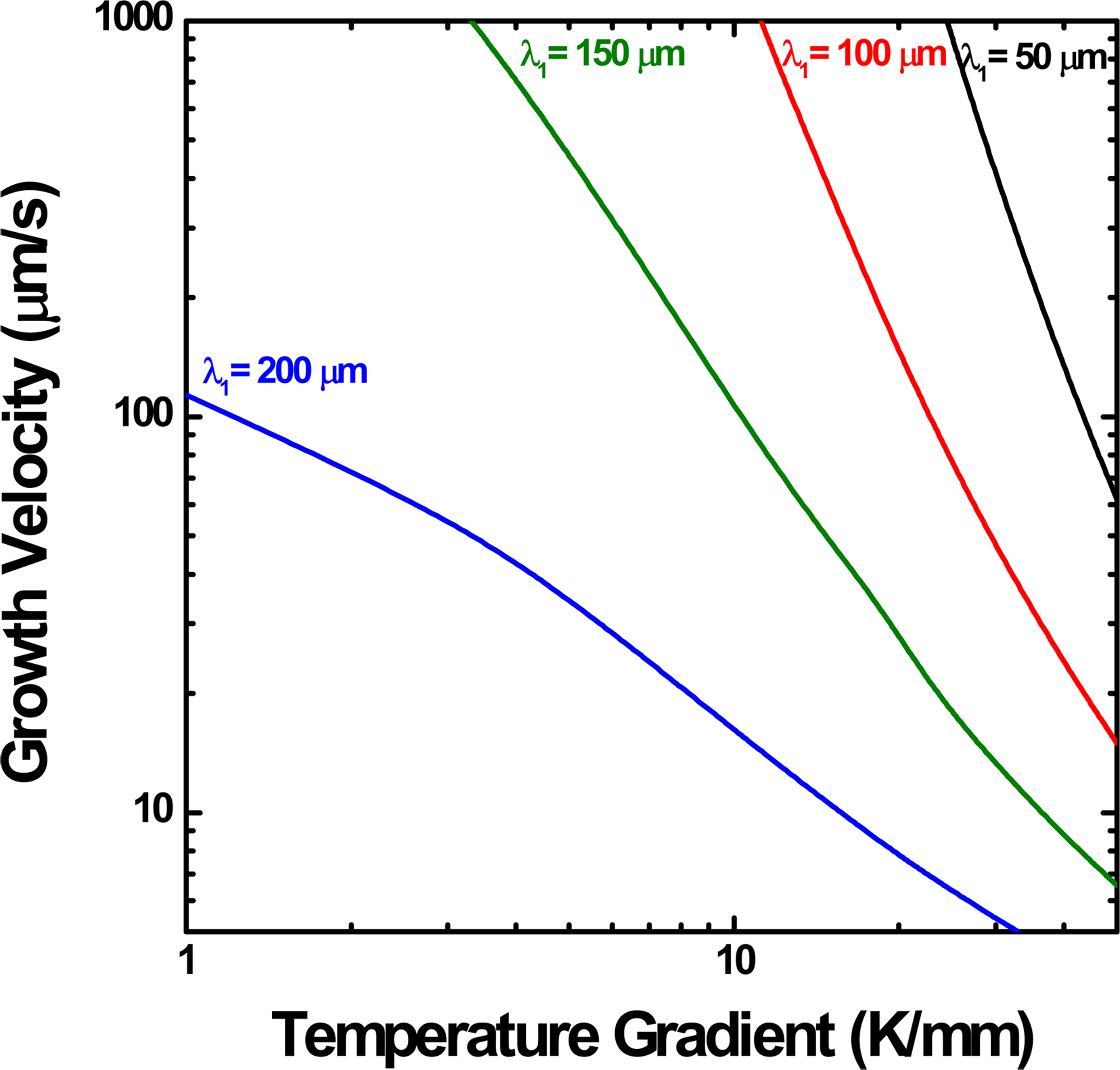 경험식을 log-log plot하면 1차 수지상 간격은 응고속도 증가에 따라서 선형적으로 감소하지만 그 기울기는 일정하지 않고 온도경사가 증가할수록