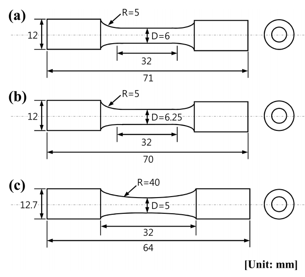 and Materials, ASTM) E8/E8M ๊ท๊ฒฉ์ ๋ฐ๋ผ ๊ทธ๋ฆผ 1(a)์ (b)์ ๊ฐ์ด ์ ์ํ์์ผ๋ฉฐ, ์์จ ์ธ์ฅ ์ํ์ Instron 4206 ์ํ๊ธฐ๋ฅผ ์ด์ฉํ์ฌ 5ร10-3s-1์ ๋ณํ๋ฅ ์๋๋ก ์์จ์์ ์ํํ์์ผ๋ฉฐ, ๊ณ ์จ ์ธ์ฅ์ํ์ Instron 5581 ์ํ๊ธฐ๋ฅผ ์ด์ฉํ์ฌ 150 ยฐC์ ์จ๋์์ 10-3์ 10-4s-1 ์ ๋ณํ๋ฅ ์๋์์ ๊ฐ๊ฐ ์ํํ์๋ค. ๊ณ ์ฃผ๊ธฐ ํผ๋ก ์ํํธ์ ๊ทธ๋ฆผ 1(c)์ ๊ฐ์ด ์ํํธ์ ์ค์ฌ ๋ถ๋ถ์ด ๊ฐ์ฅ ์์ ์ง๊ฒฝ์ ๊ฐ์ง๋ ASTM E466์ continuous radius between ends ํ์