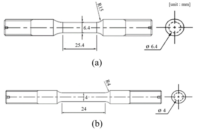 SCC 시험을 위하여 각 압연판재의 중간 부위에서 L과 T 방향으로 그림 2와 같은 봉상 형태의 인장 시편을 가공하였다. SCC 저항성 측정을 위해서 (1) 일정하중 시험법과 (2) 저속인장 시험법을 이용하였다. 일정하중
