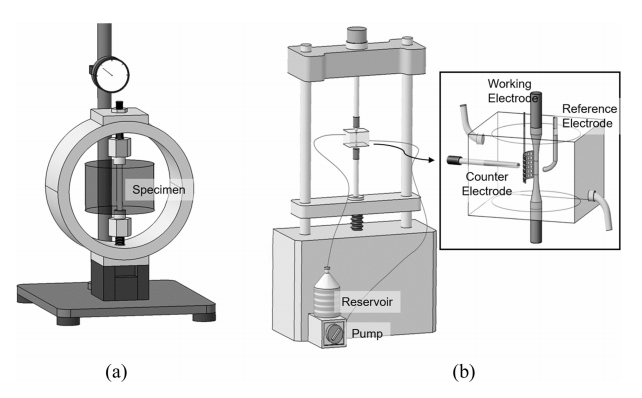 stat II)를 사용하여 0.01 Vs-1의 주사속도(scan rate)로 부식전위를 측정하였다. 그림 3은 (a)일정하중 시험법과 (b)저속인장 시험법을 모식적으로 보여주고 있다. 특성 분석을 위해 SCC 시험 후 시편의 표면과 파면은 SEM을 이용하여