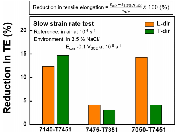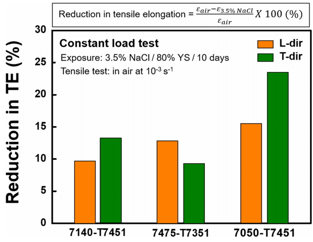 7050-T7451과 7140-T7451 합금의 경우에는 10% 내외의 연신율 감소폭을 나타내어 7475-T7351 합금에 비해 다소 낮은 SCC