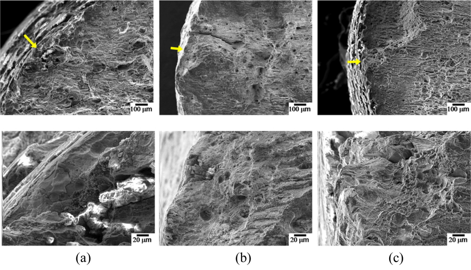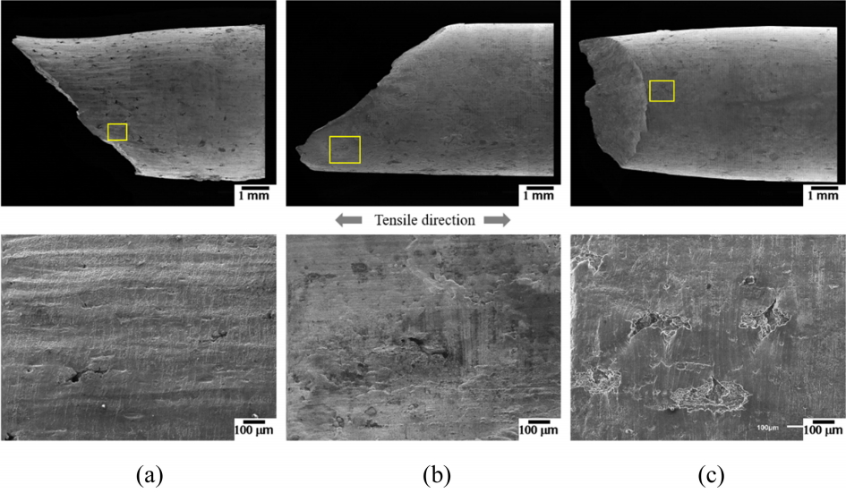 그림 5와 6은 각각 일정하중 시험 후 (a)7140-T7451, (b)7475-T7351 및 (c)7050-T7451 시편의 파면(그림 5)과 파단면 근처의 표면(그림 6)을 SEM을 이용하여 관찰한 사진을 보여주고 있다. 그림 5의 저배율과 고배율 파면 관찰에서 보는 바와 같이 봉상 시편의 중앙부에서 파단이 시작되는 일반적인 인장 파면과는 달리 세 합금 모두 피팅 형태의 부식