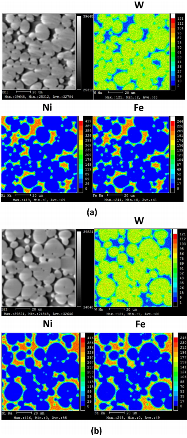 두 소재의 성분 분포 차이를 더욱 자세히 알아보고자 EPMA 분석을 수행하였으며 그 결과를 그림 4에 도시하였다. EPMA 분석 결과, 두 소재 모두 기지 영역에서는 Ni, Fe 원소가 균일하게 분포하고 있는 것을, 구형의 W 상 영역에서는 W