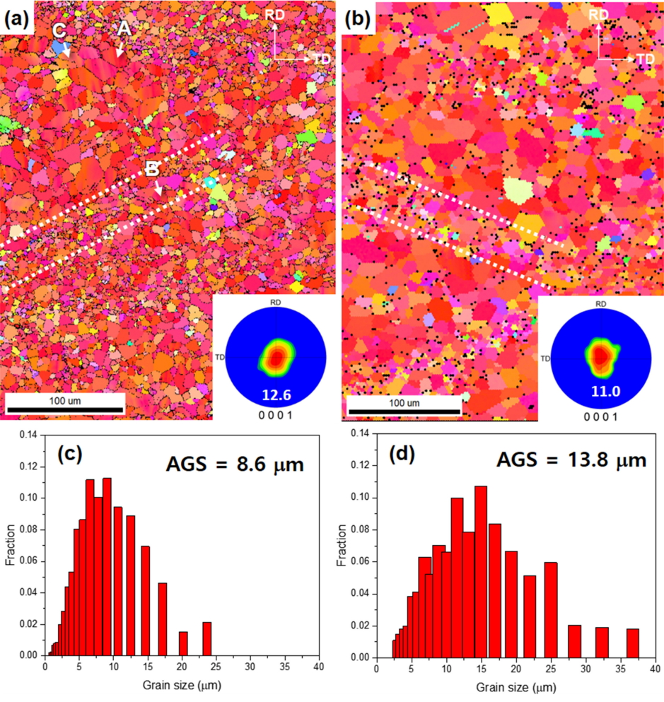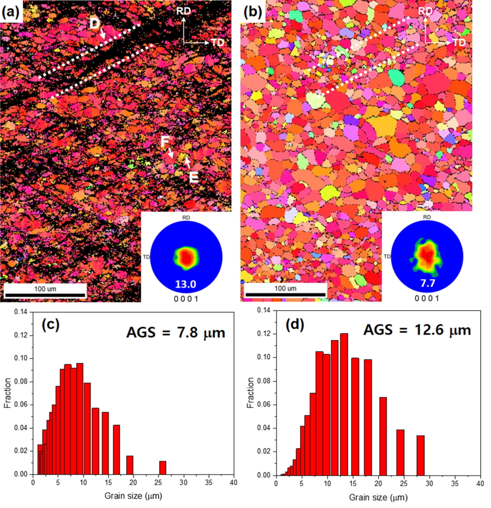 average grain size and distribution of (c) warm-rolled and (d) annealed AZ31 sheet.