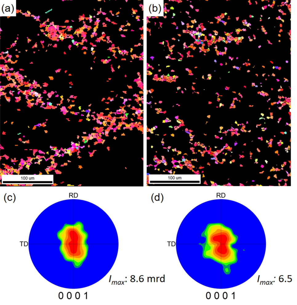 (0002) pole figures of (a, b) warm-rolled and cold-rolled and (c, d) subsequent annealed