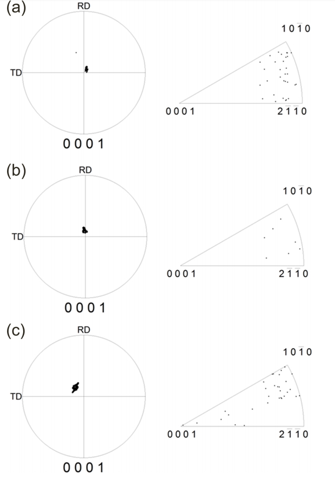 RD)으로 분리된 RD-split 형태의 집합조직을 갖는 것을 알 수 있으며, 기저면 극점도의 세기도 3.9로 낮아졌다. 재결정이 완료된 마그네슘