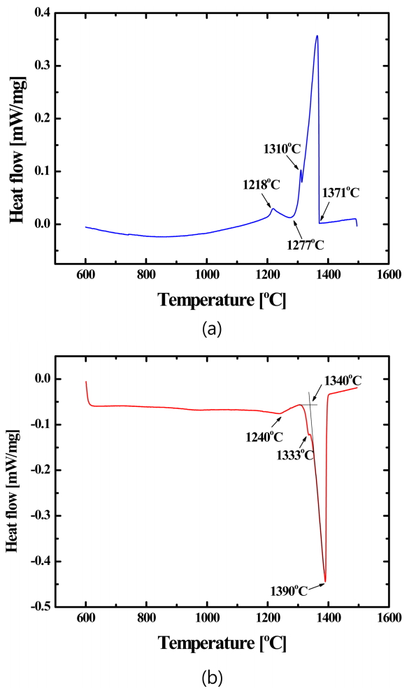 공존 구간(Mushy zone)은 94 °C인 것을 확인할 수 있었다. 가열 곡선(그림 1(b))을 통해 액상선 온도(TL)는 1390 °C, 고상선 온도(TS)는 1340 °C로 나타났다.