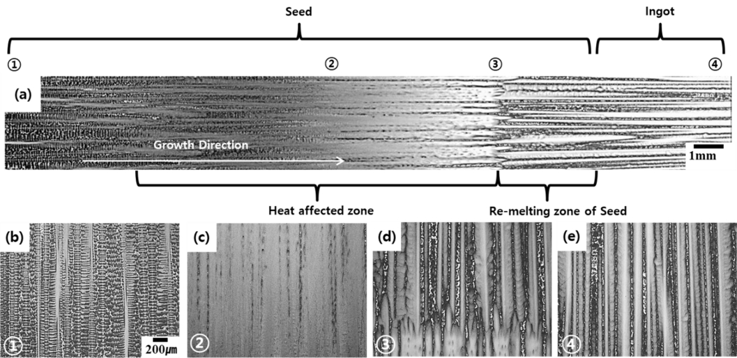 그림 2는 합금의 단결정 성장을 위해 알루미나 튜브 내 [001] 방향의 시드와 잉고트를 장입한 후 50 μm/s의 응고 속도로 일방향 응고한 시편에 대한