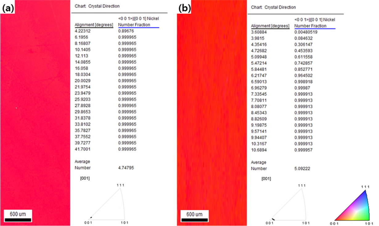 본 실험에 사용된 시드와 일방향 응고한 시편의 수지상 방위를 그림 3에 나타내었다. 시드의 경우 [001] 방향으로부터 4.7479°의 방위를 가지는 것으로 관찰되었으며, 새롭게 성장한 수지상의 경우 5.0922°의