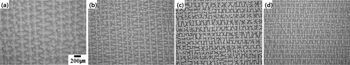 여기서 k1, k2는 상수이고, 수지상 간격은 온도 경사(G)와 응고 속도(V)에 의해 결정된다. 식 (2)와 (3)에 의하면, 1차 및 2차 수지상 간격은 온도 경사와 응고 속도가 증가할수록 감소하게 된다. 본 연구에서는 시드를 이용하여 동일한 방위의 수지상을