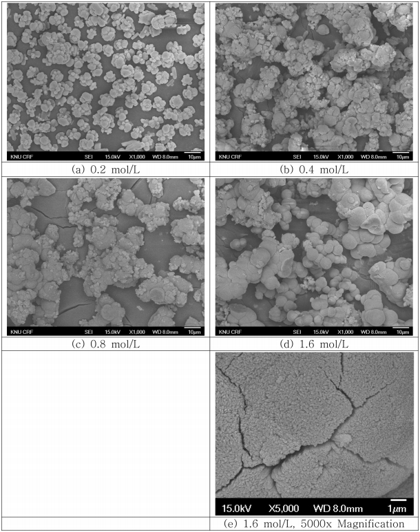 길이가 1~2 μm정도로 관찰된다. 이들이 응집하여 생성된 3차입자들은 대부분 구형을 하고 있으며, 그 크기는 1~10 μm이고 황산리튬의 농도가