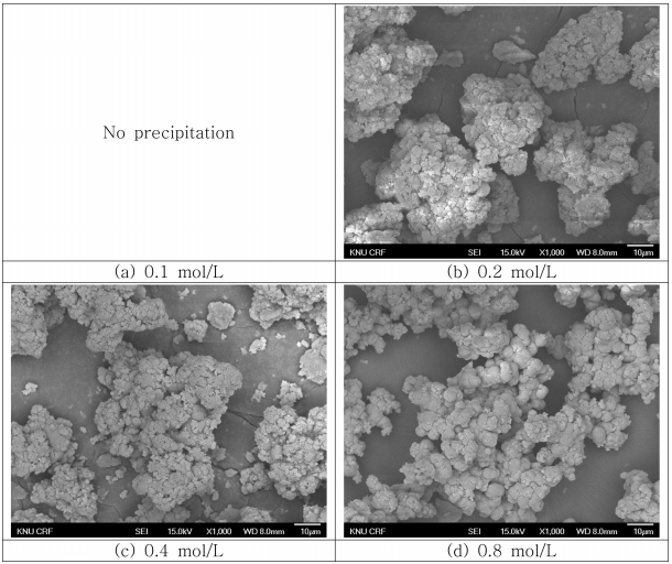 0.2 mol/L 농도의 Na3PO4 수용액 333 ml에 당량의 황산리튬 수용액을 첨가하여 인산리튬 침전을 생성시키는 과정에서 황산리튬 수용액의 농도를 0.1, 0.2, 0.4, 0.8,