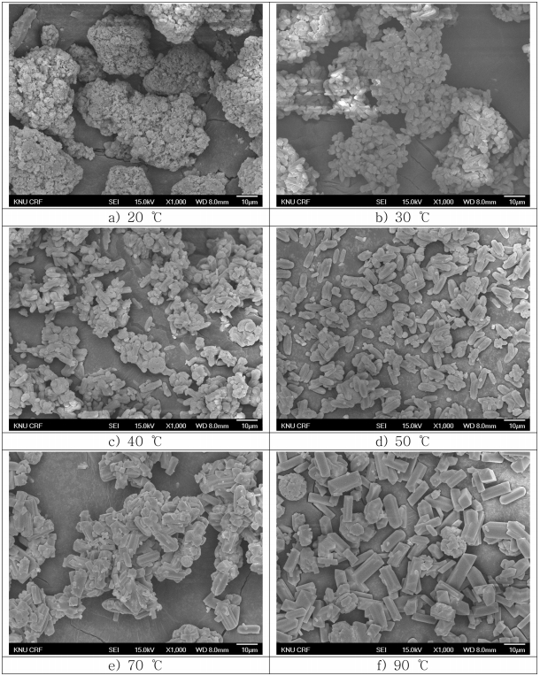 2차 입자들만이 관찰된다. 40, 50, 70, 90℃로 반응온도가 상승함에 따라 1차입자의 크기는 점점커지는 경향을 관찰할 수 있으며, 특히 90℃에서는