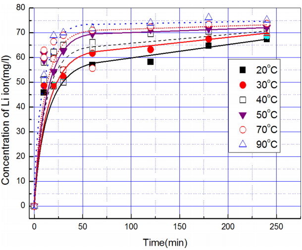 주입하고 100 rpm으로 교반하면서 일정 시간 간격으로 시료를 채취하여 시린지필터로 여과한 다음 여액 속에 잔류하는 리튬이온의 농도를 분석하였다.