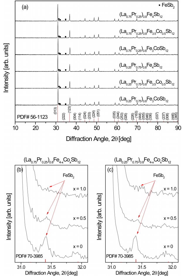 Figure 1 shows the XRD patterns of (La1−zPrz)0.8Fe4−xCoxSb12. The diffraction peaks of all specimens correspond to the standard data for the skutterudite