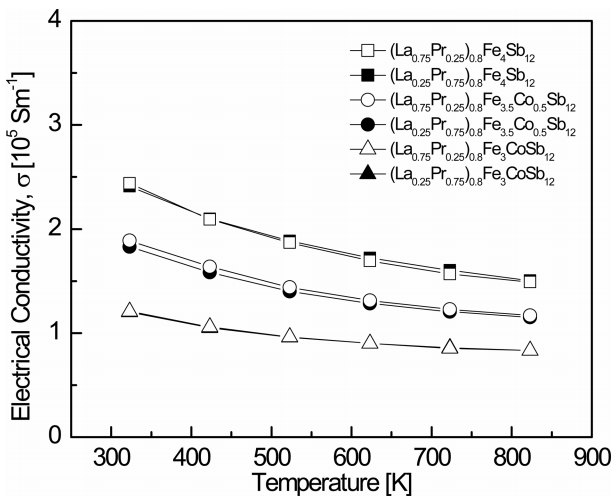 Figure 3 shows the temperature dependence of the electrical conductivity for (La1−zPrz)0.8Fe4−xCoxSb12. The electrical conductivity decreased with increasing temperature, indicating that