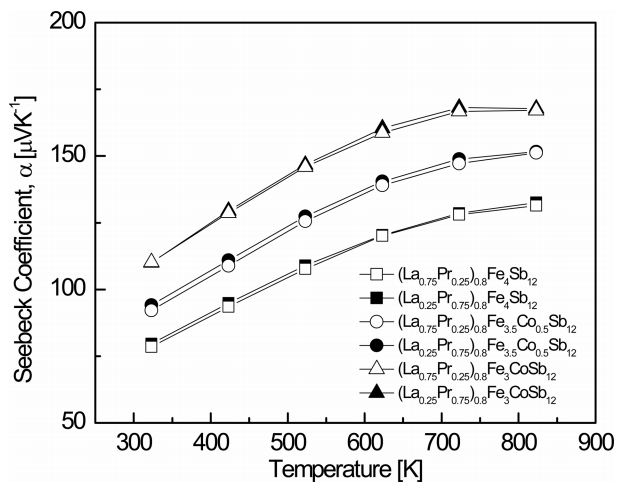 Pr filling and Co substitution. As the temperature increased, the Seebeck coefficient