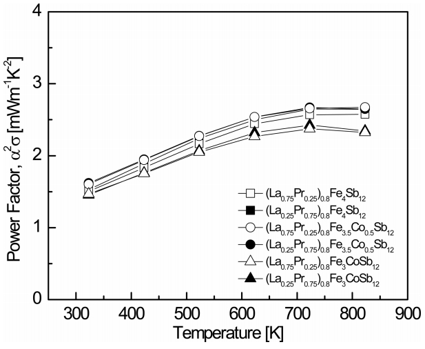 Figure 5 shows the temperature dependence of the power factor (PF) for (La1−zPrz)0.8Fe4−xCoxSb12. The PF increased with increasing temperature, and a maximum PF was found between