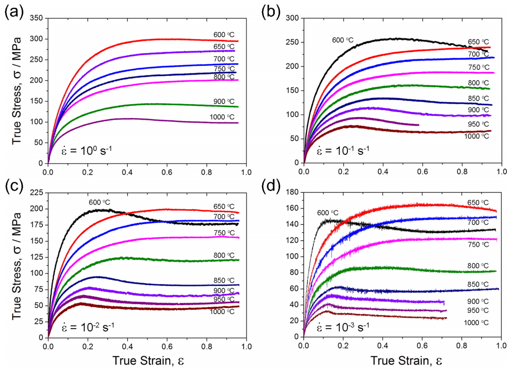 그림 1은 다양한 변형율 속도와 압축 온도에서 얻은 진응력-진변형율 곡선을 보여준다. 일반적으로 높은 온도에서는 낮은 온도에서 변형을 한 경우보다 진응력