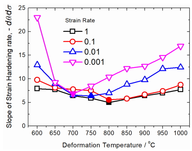 그림 5는 그림 4에서 나온 기울기의 음의 값(–dθ⁄ dσ)으로 표시하였다. 각 변형율 속도별로 좌우 두 개의 구간으로 나눠 해석할 수 있다. 그림 1에서 본 것과 같이 변형율 속도가 느리면서 고온인 경우, 오스테나이트의 동적 재결정이 발생하였다. 변형 온도가 낮아지면서 그림 5의 값이 점차 낮아지다가 닫힌 표시(■●▲▼)를 한 온도 이하에서부터는 그 값이 올라가는 것을 볼 수 있다. 이 부분에서는 오스테나이트의 동적 재결정이