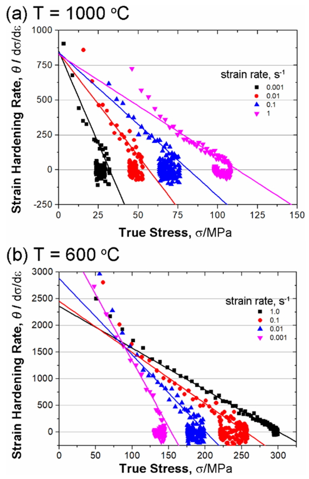 동적 재결정과 동적 회복만 나타나는 경우, 즉 변형 온도가 충분히 높은 경우에는 그림 3에서 설명한 것처럼, 세로축으로 외삽한 값이 θ0에 수렴한다 (그림 7a). 이는 그림 3과 매우 유사한 형태로 Estrin과 Mecking가 제안한 모델과 일치한다 [5]. 반면에 그림 7b와 같이 변형 온도가 600도와 같이 낮은 경우에는, 변형경화율이 변형율 속도에 따라 급격하게 변하는 것을 볼 수 있다. 즉, 변형율 속도가 빠른