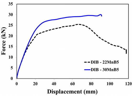 ํผ๋ง๋ 30MnB5 ๋์ด ์ํฉํธ๋น์ 29.7 kN์ ์ต๋ ๋ฐ๋ ฅ๊ณผ 91.1 mm์ ์ต๋ ๋ณํ๋์ ๋ํ๋ด์๋ค. ํ