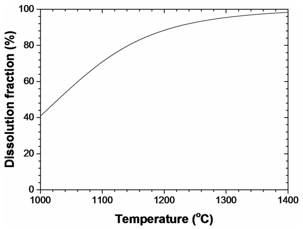 프로그램을 사용하여 계산하였다. 그림 4에 결과를 나타내었다. FL 인근에 해당하는 1350℃ 이상에서 95% 이상의 용해량을 나타내어 대부분의 Nb가 고용 상태로 존재함을 알 수 있다.