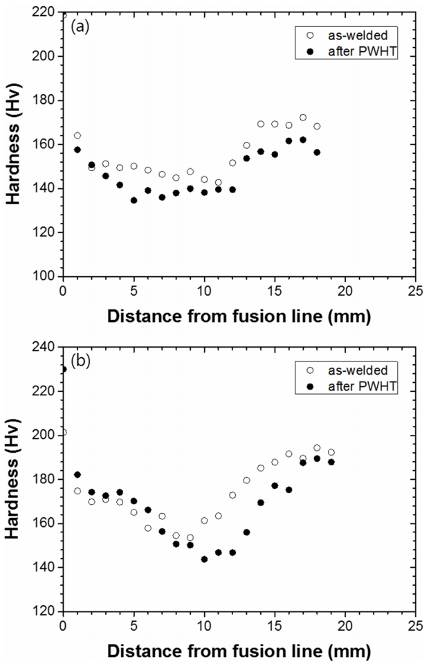 및 PWHT한 상태에서 FL로부터 하중 1 kg을 사용하여 1 mm 간격으로 비커스 연속경도를 측정하였다. 그림 5에 face에서 채취한 시편을 측정한 결과를 나타내었다. Nb를 첨가하지 않은 852강은 (그림 a) 용접한 그대로 상태보다 PWHT한 상태에서 전체