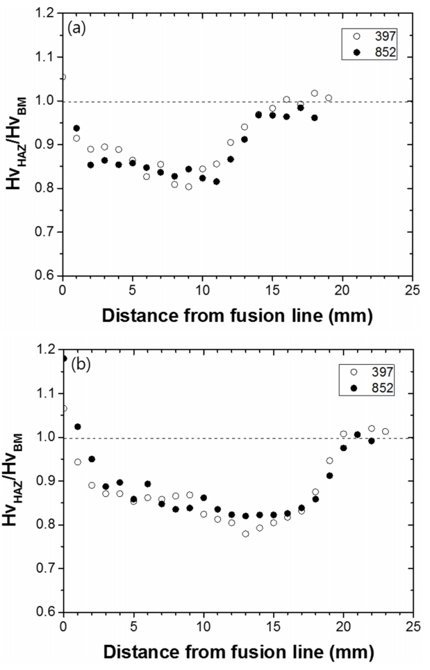 Hv)로 나누어 그 비를 그림 9에 나타내었다. 비가 1 이하인 영역은 모재보다 경도가 저하된 소위 연화영역이다. Face에서 채취한 시편의 경우 (그림 a) 두 강 모두 FL에서