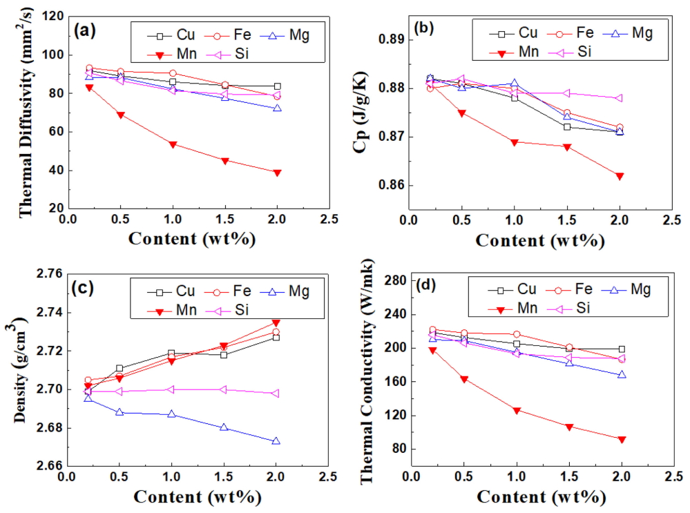 순수 Al 대비 다이캐스팅용 Al 합금의 낮은 열전도도는 합금의 주조성이나 제품의 물리적·화학적 특성 향상을 위해 첨가되는 소량의 금속원소로부터 기인된