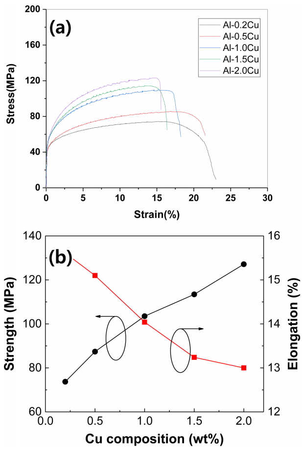 바와 같이 Al 합금의 강도는 Cu와 Mn의 첨가로 향상될 수 있다 [5-7]. 본 연구에서는 앞선 열전도도 분석결과를 토대로 강도 향상을 위한 Mn 첨가는 배제하였고, Cu의 함량만을 0.2~2 wt% 범위로 조절하여 Al