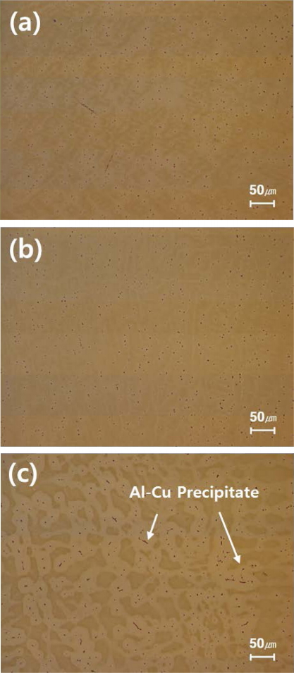 나타내었다. 반면 연신율은 점차 감소하는 경향을 보여 최소 13%를 나타내었다. 그림 3(a)~(c)는 Cu 함량 변화에 따른 Al 합금시편의 미세조직을 나타낸다. 그림에서 알 수 있듯이 Cu 함량이 증가함에 따라 조직 내 Al-Cu 2종 금속간