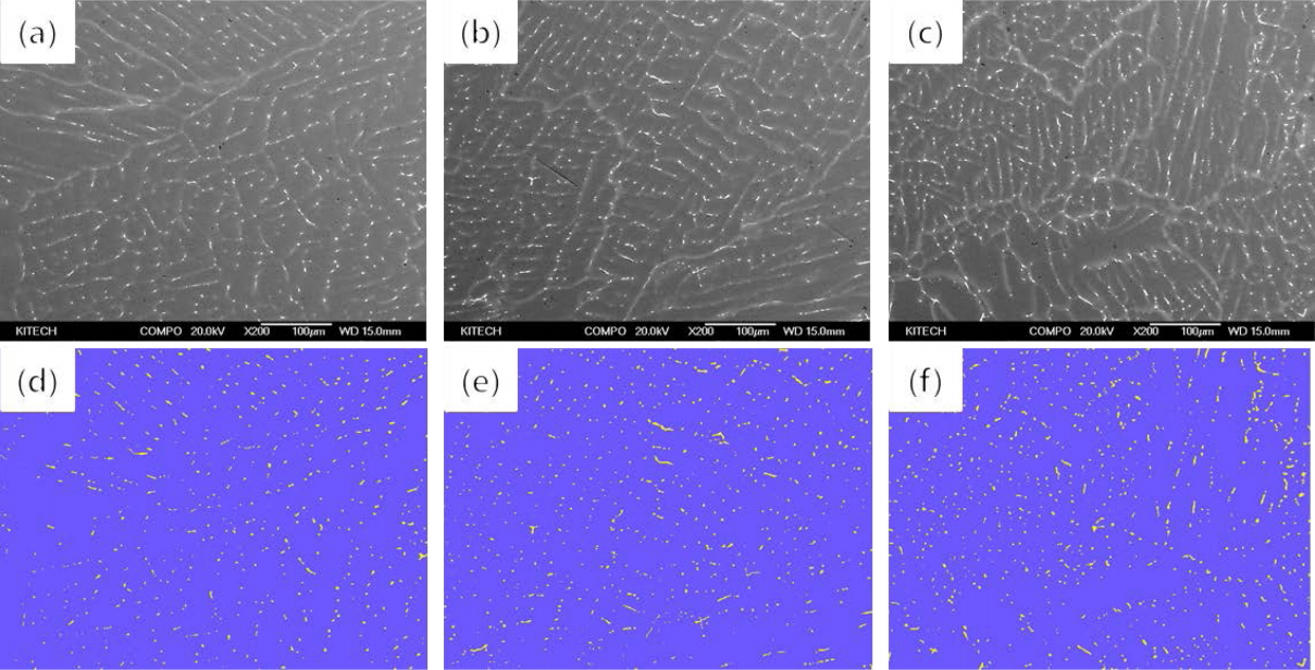 화합물의 석출량이 증가하였다. Cu 첨가에 의한 조직 내 Al-Cu 석출상 증가 현상을 확인하기 위하여 그림 4에 나타낸 바와 같이 FE-SEM으로 미세조직을 분석한 후, image analysis를 통해 Al-Cu 석출상의 면적 분율을 측정하였다. 분석 결과,