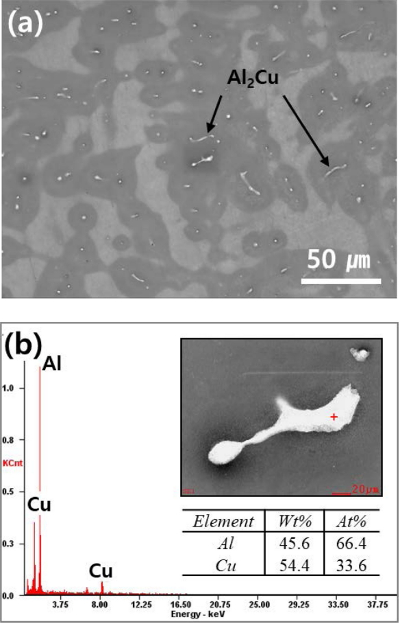 알 수 있었다. 그림 5에 나타낸 FE-SEM 및 EDS 측정결과 이 금속간화합물은 45.6 wt%Al-54.4 wt%Cu로 구성된 Al2Cu 석출상임을 알 수 있었으며